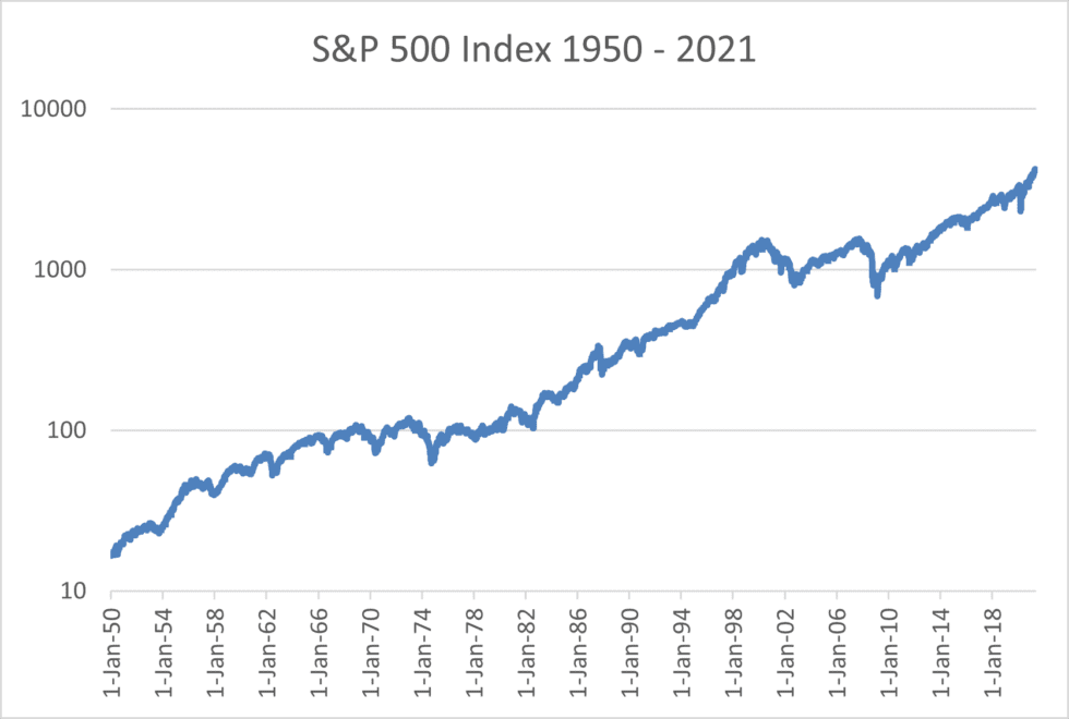 Look at the above stock market chart. In 1950 the S&P 500 index stood at 16.66. At year-end 2021 it stood at 4,766.18. That is an increase of 28,509%, and that’s before dividends are included. How could anyone have possibly lost money during that period???