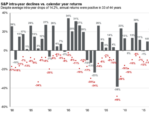 Yes, stocks can drop. Sometimes a lot. That’s not exactly news, nor should it be long-term consequential. How we react to those times of stock market duress, however, is very consequential. The chart below from JP Morgan’s Guide to the Markets shows the annual...